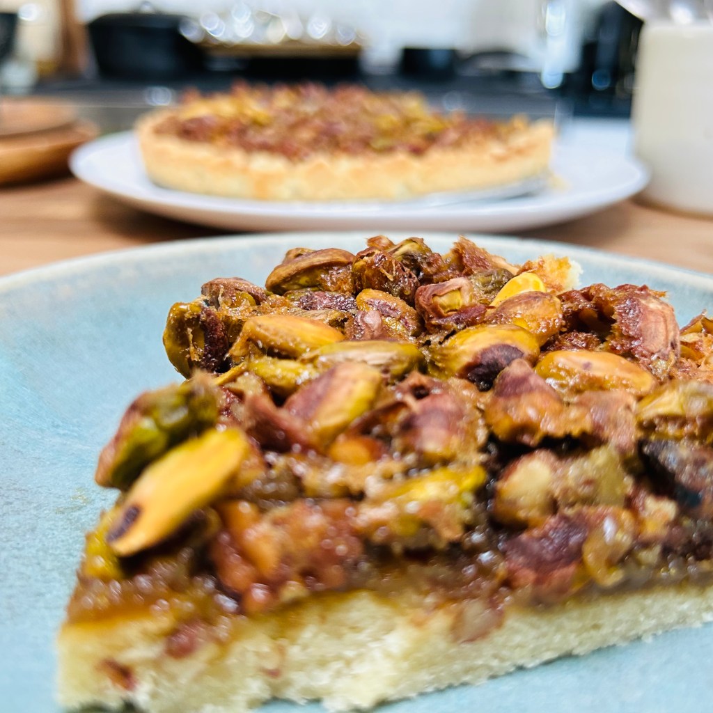 Pour the filling into the shell. Arrange 1/2 C whole pistachios on the filling. Cover with foil and bake at 350 for 35 minutes. Remove foil and cook 15 minutes more. Cool for 10 minutes and remove from the pan.