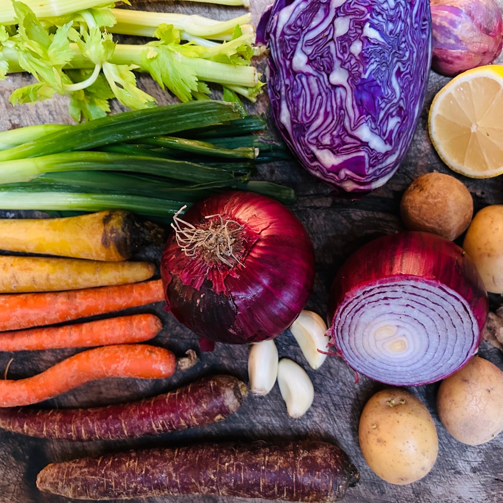 I started by cutting up a couple of carrots, half a purple onion, two cloves of garlic, a shallot, and two stalks of celery. I sautéed these in my soup pot in a generous glug of olive oil until they were softened with a bit of color.
